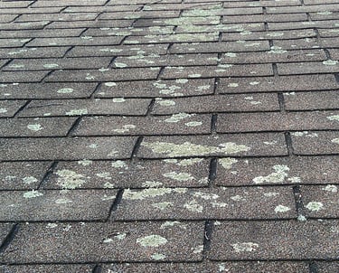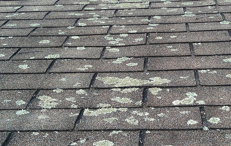 Lichen is a crusty, leaf-like growth that's made of algae and fungus and can appear on many surfaces of a house, including roofs, walls, and siding. It can come in many colors, including blue, green, white, black, grey, yellow, orange, red, and brown. While lichen can be undesirable, it does have some benefits, such as regulating moisture buildup on surfaces. However, lichen can also damage stone and woodwork over time due to its chemical makeup and the moisture it attracts. In particular, surfaces with a lot of lichen can deteriorate faster, especially in the winter when moisture freezes.
